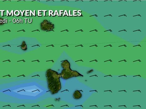 L’analyse de la situation, sur la base de notre modèle METEO CONSULT, montre un scénario classique. Dans un premier temps, l’alizé de nord-est autour de 15 nœuds devrait se maintenir au nord-ouest de l’île, près de Deshaies. Il baissera ensuite partiellement autour de 10 nœuds, entre Deshaies et Vieux-Habitants à quelques milles de la côte, alors que des calmes s’observeront près du rivage. S’en suivra la partie la plus délicate à gérer, la descente vers Basse-Terre et la remontée vers l’arrivée mercredi, entre la fin de nuit et le début de matinée, heure française. Le vent pourrait dès lors tomber quelques heures, avant de reprendre un peu de vigueur à l’approche de la baie de Pointe-à-Pitre.