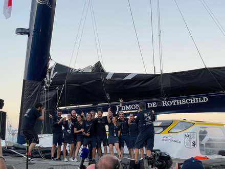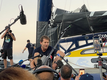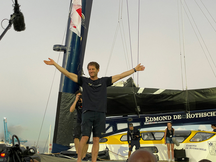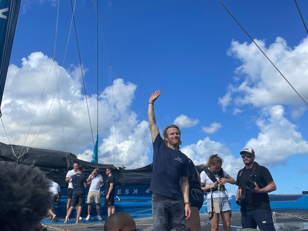 Il y a du monde sur le ponton lorsque le géant arrive, avec les premières lueurs du jour, sous un tonnerre d'applaudissements : le public est venu nombreux pour accueillir le skipper. Un salut, un sourire ému et fier, c'est parti pour les premières interviews avant même de poser le pied à terre. Charles Caudrelier se prête au jeu avec plaisir, il est fier de sa victoire et on le comprend !