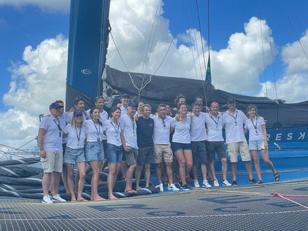 Puis vient le moment de faire péter le champagne : tout le monde est heureux et toute l'équipe grimpe à bord de l'Ultim 32/23 pour la traditionnelle photo de groupe. Direction ensuite la grande scène, sous une vague de félicitations où Charles Caudrelier se verra remettre le trophée de la victoire !