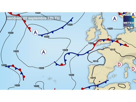 Samedi, conditions de vents faibles sur sud Gascogne générés par la présence d’un anticyclone à 1013 hPa. Régime faiblement perturbé de sud-ouest sur nord Gascogne, piloté par un système dépressionnaire se formant sur ouest Irlande, avec une dépression se creusant à 1001 hPa.
