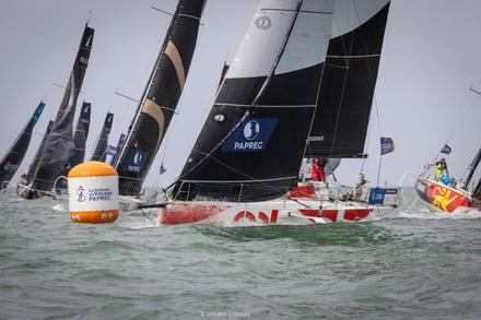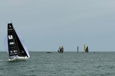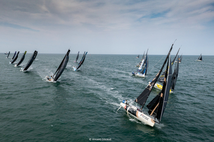 Depuis le bateau de l’organisation : le départ vu au plus près, au milieu des Figaro lancés à pleine vitesse.