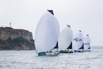 Le départ, donné sous un flux de sud-est d’une quinzaine de nœuds, a offert un spectacle intense. L’exercice du « départ à l’anglaise », vent de travers, a obligé chacun à jouer sur le fil. Trop tôt lancé, Paul Morvan (French Touch - Foricher) a dû recouper la ligne, tandis qu’Alexis Loison (Groupe REEL) menait la flotte sur la première marque, talonné par Jules Ducelier (Région Normandie) et Jules Delpech (P’TIT DUC).