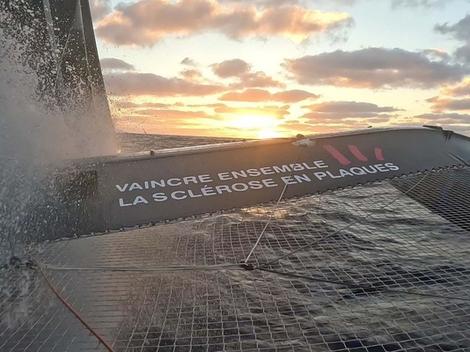 Belle trace que celle du monocoque noir et rouge de Jérémie Beyou et Franck Cammas !Positionnés à l’ouest de toute la flotte, ils ont progressé nettement plus vite que les bateaux qui s’étaient décalés sous leur vent et se ré-alignent devant eux ce matin en touchant plus tôt le nouveau vent comme le confirme Franck Cammas : « C’est bien revenu par l’ouest ce matin. Là, ça va vite à plus de 25 noeuds. On gagne vers le Sud avec un petit clapot de face pas très agréable et on reste calfeutrés sous notre casquette ! » Au classement, Charal a toujours la main mise sur un paquet de cinq ou six IMOCA dans lequel on trouve Paprec-Arkéa (Richomme-Eliès) en pointe devant For The planet (Goodchild-Koch) et Initiatives coeur (Davies-Boutell). Mais la palme au classement est à décerner ce matin à Teamwork. Bien décalés dans l’ouest, les « Jujus »comme on surnomme sur les pontons Justine Mettraux et Julien Villion font un superbe début de course avec leur bateau de 2018 qu’ils ont su préserver coup de vent et font marcher très fort. Pas de forfanterie à bord néanmoins et Julien Villion constatait ce matin avoir « moins de facilité que Charal de transformer l’avantage de l’ouest en abattant de quelques degrés pour passer à la caisse ».