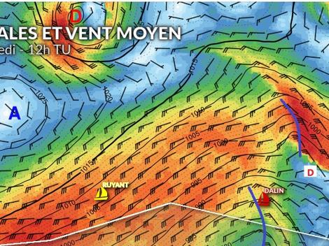 Thomas Ruyant et ses compagnons connaissent des vents un peu moins forts s’ils s’approchent du centre de la dépression. Avec le vent dans l’axe de la route, ils doivent encore envisager bon nombre empannages.