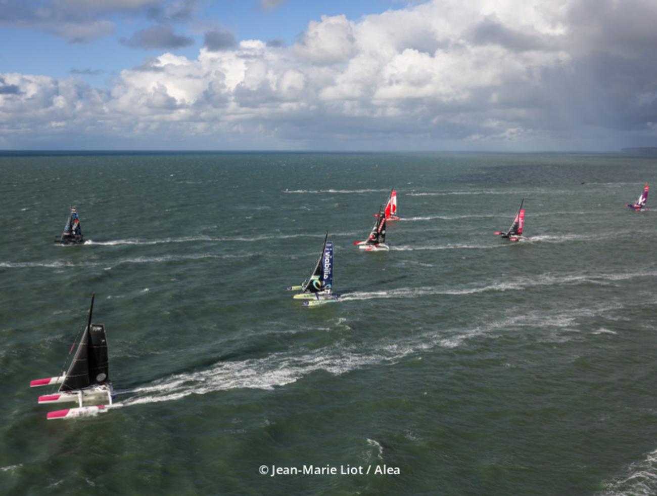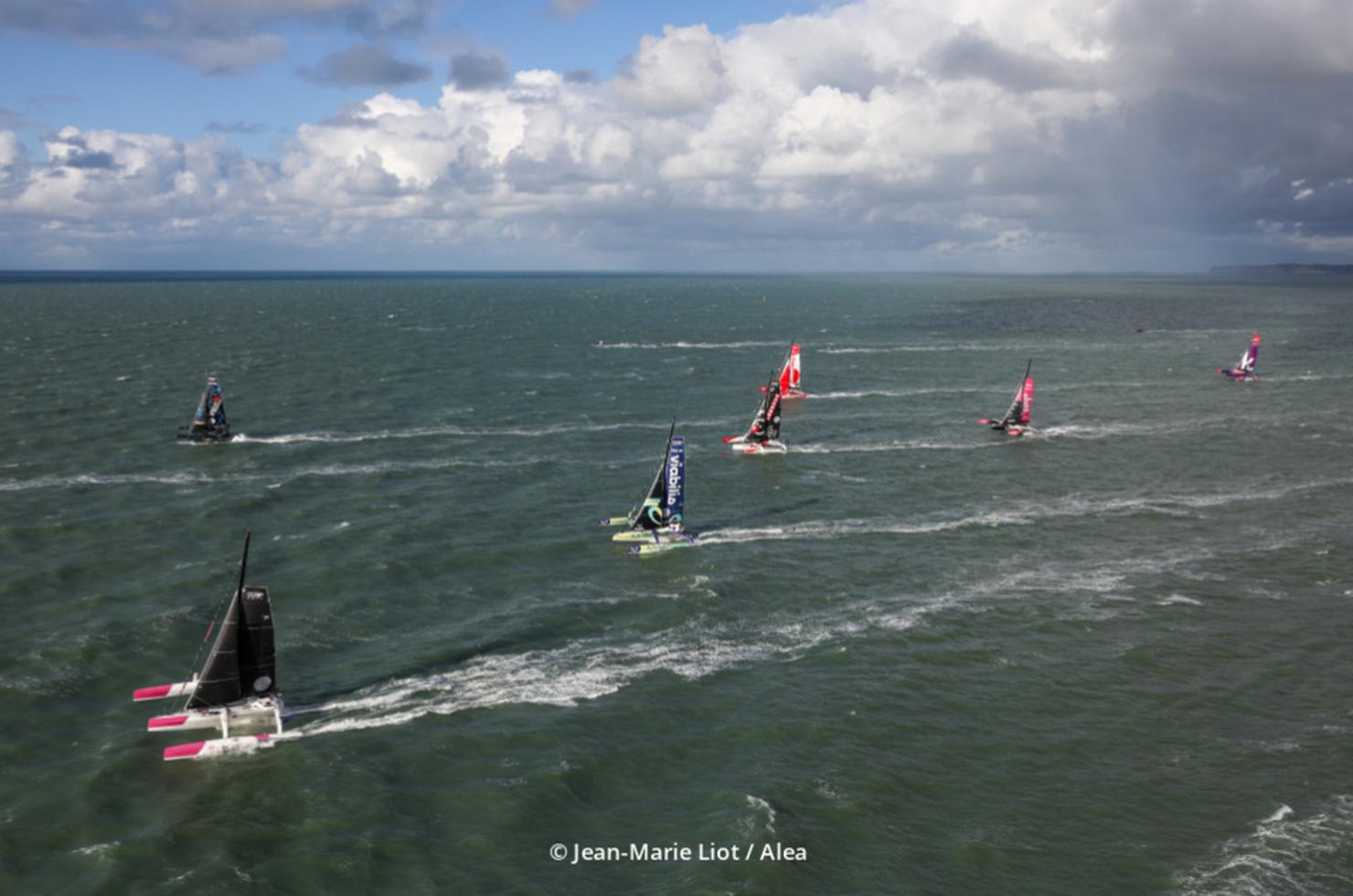 À 13 heures pétantes, c’est Lazare X Hellio de Tanguy Le Turquais et Erwan Le Draoulec qui ouvrait le ballet des départs. Le trimaran rose se faufilait vers le bassin de l’Eure où sont amarrés les ULTIM et où le public découvrait en arrière plan l’imposant Artemis, voilier cargo de 81 mètres arrivé vendredi au Havre. Quelques minutes plus tard, les Ocean Fifty rentraient dans le vif du sujet pour rejoindre la zone de départ, mouillée à 3 milles dans le Nord-ouest du cap de la Hève.