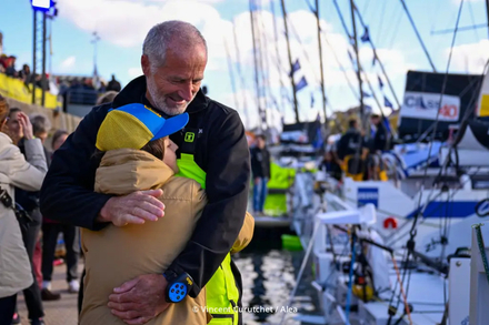 Dans ces moments-là, tout va vite. Derniers « au revoir », salutations des membres de la direction de course, amarres à larguer, regards vers le ponton puis vers le haut du bassin. Les skippers en connaissent tous la rythmique mais l’émotion s’infiltre sans crier gare. Sasha Lanièce (Alderan) a les larmes aux yeux au moment de quitter les pontons. Les enfants de Fabien Delahaye (Legallais) poussent le bateau, sourient et se mettent à pleurer dès que le bateau du papa est parti. Personne ne résiste vraiment, même Michel Desjoyeaux. Le « Professeur » s’amuse et enchaîne les bons mots. Puis il prend son fils dans les bras. L’étreinte est un peu plus longue, plus intense aussi. Michel retient un sanglot puis se retourne pour ne pas le montrer.