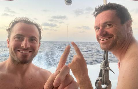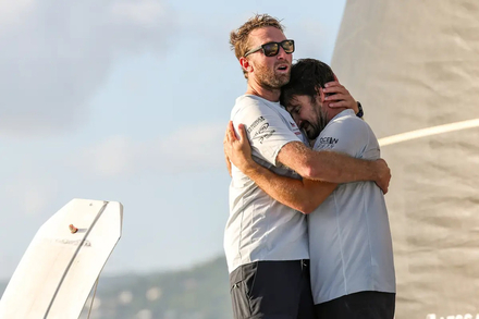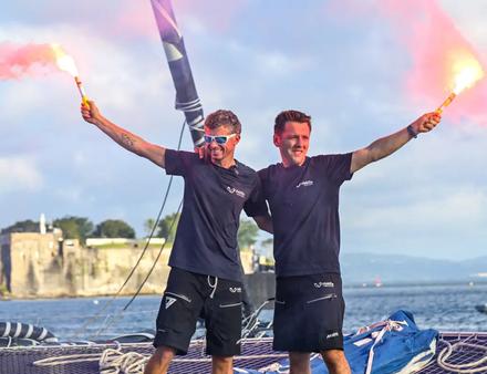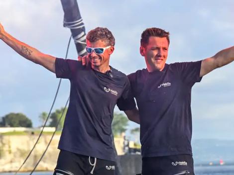 17 min après Viabilis Océans, Pierre Quiroga et Gaston Morvan franchissent à leur tour la ligne d’arrivée. Eux qui étaient encore en tête de la flotte quelques heures auparavant brandissent fièrement leurs fumigènes jaune et bleu, aux couleurs du bateau, même si la fin de course n’est pas exactement celle escomptée. Priorité aux proches, Pierre saute du bateau pour tomber dans les bras de sa mère avant de revenir sur cette fin épique. "Le sportif est forcément frustré d'avoir échoué à si peu de la première place", concède Pierre Quiroga. "Cette victoire était à portée de main ce matin encore", mais vu la jeunesse du projet, "signer aujourd'hui une deuxième place, c'est parfait." Même sourire à sa droite chez son co-skipper Gaston Morvan, "quand on est arrivé au Diamant, on n'avait pas trop le moral. Le fait de voir le Rocher, de retrouver les bateaux suiveurs et de goûter la joie de la Martinique et de l'arrivée, on a un peu oublié." Un tandem qui a brillé tout au long de la TRANSAT CAFÉ L’OR. "Le secret pour tenir une régate sur l’Atlantique", confesse Pierre, "c’est d’avoir un duo sans faille, un duo dans lequel tu as confiance à 100%."