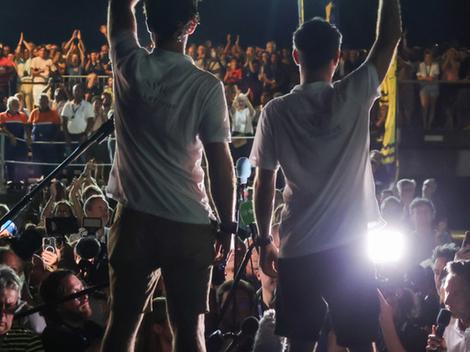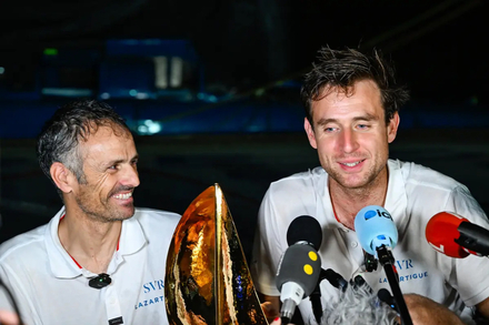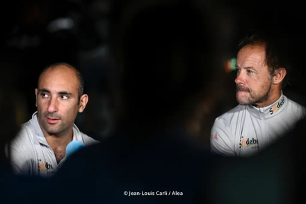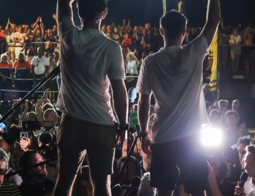 Sur le ponton d’honneur, c’est l’affluence des grands jours. La structure penche fortement, on se presse pour observer les deux hommes. Nouveaux fumigènes, salves d’applaudissements, trophée remis des mains de la marraine de la course, Claudie Haigneré. La copine de Tom Laperche se cache derrière le haut du foil, les caméras se braquent sur les vainqueurs. Ils se laissent porter par le moment, ils ont les yeux qui brillent. Face à une forêt de micros, ils évoquent une course « hyper intense et hyper physique » (Tom), « une tension permanente » (Franck). Les yeux brillent encore. Peut-être disent-ils un peu du vertige du moment : Tom qui réalise progressivement qu’il vient d’offrir à SVR-Lazartigue sa plus belle victoire depuis son arrivée dans l’équipe il y a six ans ; Franck qui se rend compte qu’il est l’unique recordman de victoire à la TRANSAT CAFÉ L’OR et qu’il y a chez son benjamin beaucoup de ce qu’il a été. « Ce qu’on a vécu avec Franck est hyper fort » abonde Tom. « Il est jeune, il peut en remporter beaucoup" s’enthousiasme Franck. L’émotion qui a été un temps palpable est ensuite dissipée progressivement par le récit de la course, l’effusion de joie avec l’équipe et les multiples sollicitations. Reste une certitude : tout leur sera plus doux désormais, la nuit comme les jours qui viennent.