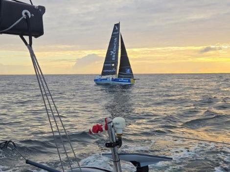 Près de six jours après avoir quitté Concarneau, ils sont encore 19 duos en lice. Lola Billy et Corentin Horeau (Région Bretagne CMB - Océane) en font partie, eux qui ont dû s’arrêter à Cascais pour réparer leur safran après avoir heurté un objet flottant. « C’est reparti après ce petit pit-stop », assurait Corentin Horeau en fin d'après-midi hier. « L’équipe a assuré, comme une équipe de F1 », s’amuse Lola Billy. « ls ont changé de safran et, en repartant en tribord amure, on a bien vu que le bateau était à 100 % », précise Yann Chateau à la direction de course.