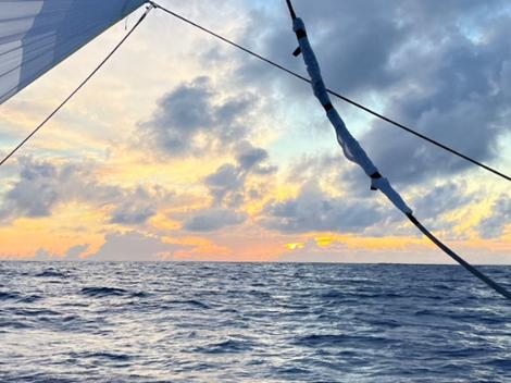 D’autres ont immortalisé le coucher de soleil comme Maggie Adamson et Calanach Finlayson (Solan Ocean Racing), Anaëlle Pattusch et Hugo Cardon (Humains en action). Martin Le Pape et Mathilde Géron, eux, ont été pris en photo par un cargo français et ont pu échanger avec eux par la VHF. De leurs côtés, Ellie Driver et Oliver Hill (Women Engineering Society) ont pris le temps de revenir sur leur rencontre avec une baleine. Cindy Brin et Thomas André (Cap St Barth) se sont activés pour enlever les poissons-volants qui se sont faufilés partout sur le pont. Romain Bouillard, lui, a fait une vidéo de Poulpie, son poulpe en peluche. « Il a été mouillé et pourtant il ne se plaint jamais. C’est un gars chouette ! » Mathilde Géron, elle, a découvert les petits mots que ses filles lui ont écrits. « Allez maman, tu es la meilleure ! Faut que tu nous ramènes la coupe ! » Il n’y a pas mieux pour rester motivé jusqu’au bout !