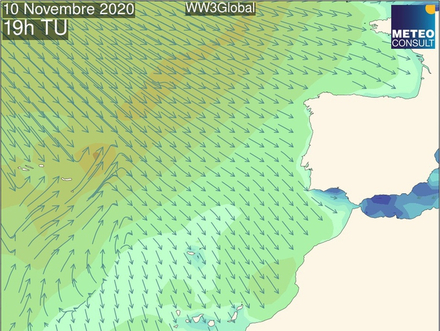 La carte ci-dessus montre que la houle s’amplifiera ce mardi soir en allant vers l’ouest. Les conditions deviendront alors plus difficiles dans une mer croisée avec une houle de l’ordre de 3 mètres arrivant d’ouest-nord-ouest et les vagues formées par le vent de sud se renforçant.