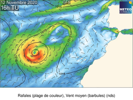 Sur la carte ci-dessus, on aperçoit très bien la dépression tropicale Theta au sud-ouest de la zone qui engendrera des vents de 50 à 60 nœuds en rafales autour de son centre. Les navigateurs devront éviter à tout prix de trop s’approcher de ce système dangereux car les conditions sous celui-ci seront tempétueuses. Ils devront donc rester sur une route très à l'ouest pour ne pas subir les vents violents liés à la dépression.