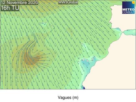 Sur la carte ci-dessus, on peut voir que la mer deviendra forte à l’approche de la dépression tropicale avec des vagues de 6 à 7 mètres à l’arrière et au sud du centre dépressionaire. Les conditions de mer seront beaucoup moins fortes sur la trajectoire des skippers situés suffisament loin du coeur dépressionaire. Ils verront arriver une houle de nord-ouest de 2 à 3 mètres. En continuant de naviguer entre l'anticyclone et la dépression tropicale, ils devraient trouver une porte d'entrée sur la route des alizés aux latitudes tropicales.