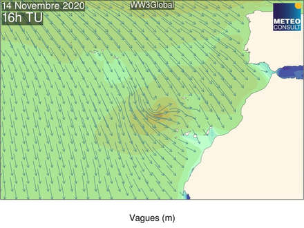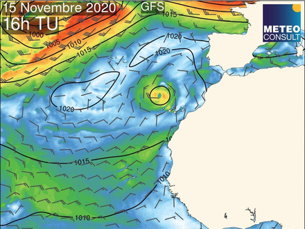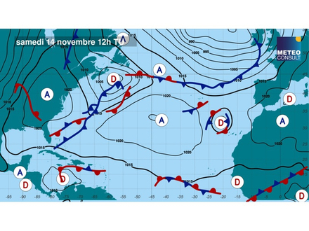 Ce vendredi 13 novembre, la dépression tropicale Theta est située entre les Açores et les Canaries. Elle est prise en étau entre un anticyclone s’étendant des Bermudes aux Açores et un autre anticyclone plus à l’est en direction des Canaries. La dépression avance très lentement vers l’est. Les skippers devront la contourner par l’ouest pour toujours bénéficier de vents portants malgré les conditions très difficiles de rafales tempétueuses et de mer forte les obligeant à de fréquents empannages toujours très délicats dans ce type de situation. Cette route reste la plus sécuritaire pour éviter les plus fortes conditions.