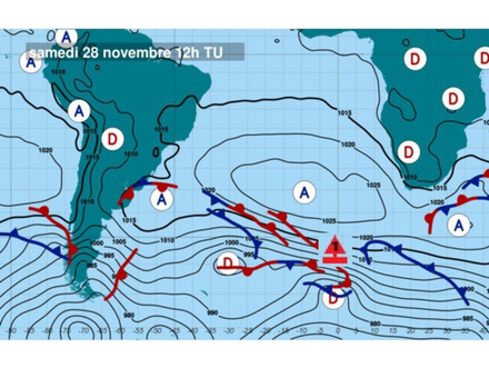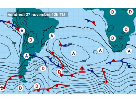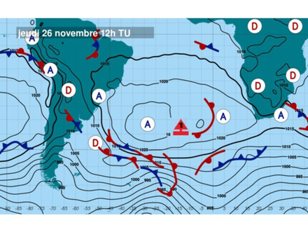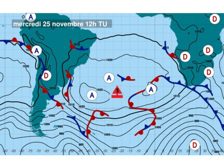 Le peloton de tête sera sans doute assez regroupé après ces 48 heures de petites conditions. Ils auront en ligne de mire, le grand flux d’ouest des 40èmes rugissants qu’ils commenceront à toucher dans la nuit de jeudi à vendredi. Ce sera la fin de la galère pour les concurrents de tête, aussi bien pour ceux qui auront choisi l’option vers le sud-est que ceux qui auront préféré descendre plein sud. Vendredi matin, les vents de nord-ouest se lèvent et se renforcent rapidement pour permettre aux skippers de s’élancer vers les 40 ème rugissants sur un seul bord dans une mer grossissante et des conditions plus musclées. Le changement sera radical et il conviendra de la préparer. Vendredi soir, il sera possible de faire un cap plein est pour profiter de l’autoroute du sud au niveau du 43° de latitude tout en restant en marge de la zone d’exclusion plus au sud où se trouvent les growlers et icebergs qui se détachent des glaciers. A l’arrière, il est fort probable que les poursuivants immédiats soient régroupés mais commençent eux aussi à bénéficier de la levée progressive du flux de nord-ouest.