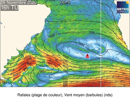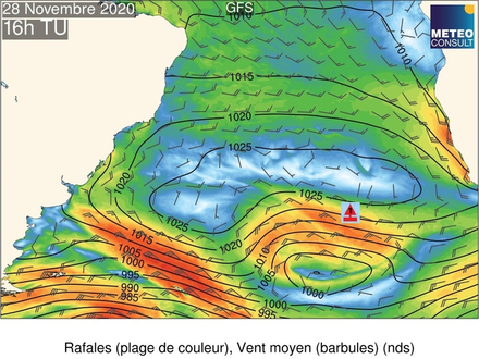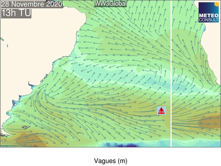 L’anticyclone, à 1030 hPa, sera situé globalement par 20°W et 37°S, tandis que le petit minimum relatif, à 1022 hPa, sera par 5°E et 35°S. Il est probable que la tête de flotte, dont Charlie Dolin et Thomas Ruyant, aura fait une route vers le sud-sud-est pour se faufiler entre ces deux centres d’action, juste dans l’étroit couloir afin de ne pas se retrouver empétolé. L’option plus à l’ouest pourrait elle s’avérera payante, grâce à un flux de nord-ouest se levant en bordure ouest de l’anticyclone, mais elle restera nettement plus éloignée de l’orthodromie (la route directe). Il est probable que cette journée voit la réduction des écarts entre les concurrents de la première moitié du classement, dans une situation de vents faibles défavorables propices à de nombreuses manoeuvres et choix tactiques.