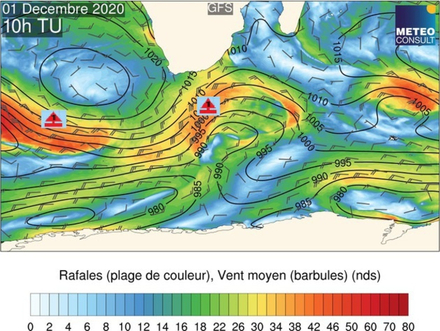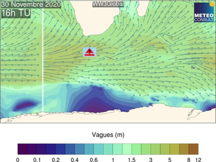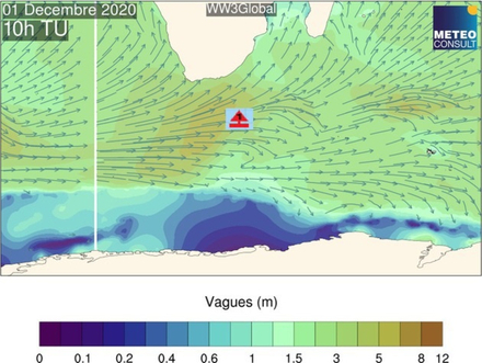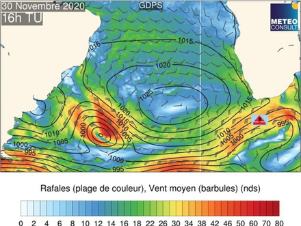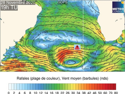 Comme le montrent les cartes, la dépression des basses latitudes se trouvera vers 58°S et 9°E en se comblant lentement. L'anticyclone de Sainte Hélène restera lui situé très bas par rapport à la normale, vers 38°S et 21°W en s'étirant par une dorsale jusqu'au sud du Cap de Bonne Espérance. Cela obligera les concurrents à naviguer dans le couloir de vent portant, compris entre la zone d'exclusion au sud, et le calme induit par la dorsale au nord. La marge de manoeuvre restera suffisante en restant à l'avant du front, mais après être remonté lentement vers l'ENE afin de garder une allure favorable, il faudra envisager un changement de bord pour redescendre légèrement vers le SE afin de bénéficier d'une allure portante. Au fil de leur progression, les bateaux de tête trouveront un vent de plus en plus portant ce qui imposera des manoeuvres toujours périlleuses par vents forts. Un nouveau changement de bord sera donc probable pour redescendre vers le sud. Ce type de navigation d'ici à mercredi s'annonce très physique.