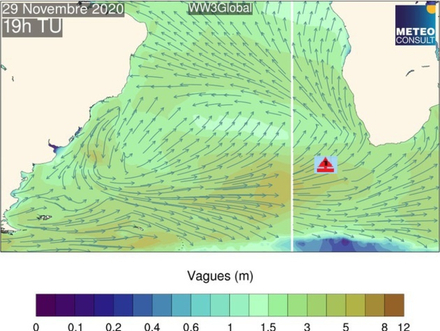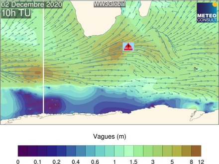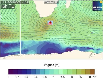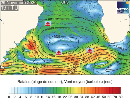 Ces grosses conditions de mer et de vent concerneront probablement la première moitié de la flotte, qui se trouvera dès lors confronté à une période difficile. Une lente atténuation des vents devrait ensuite s'observer à l'arrière, pour les skippers qui passeront le sud du Cap de Bonne-Espérance à ce moment-là, avec un vent de secteur SW entre force 6 et 7 Beaufort, soit entre 22 et 28 noeuds de vent moyen. La mer sera très grosse pour toute la première partie de la flotte, avec des vagues montant à 6 m.