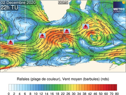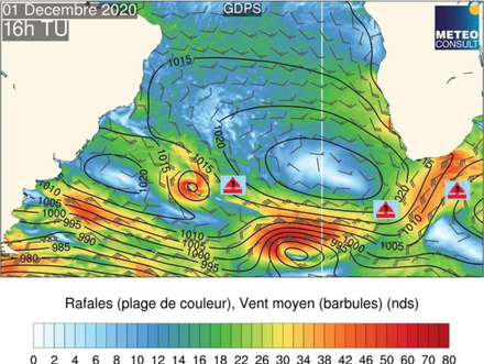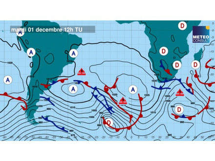 Ce mardi sera une journée difficile mais importante dans le Vendée Globe car le peloton de tête sera passé dans l'océan Indien. Ce sera aussi le premier jour de l'été météorologique dans l'hémisphère sud. Les conditions seront musclées en lien avec une dépression circulant au sud des concurrents et qui aura tendance à remonter un peu vers 48° S et 34 E. Elle génère toujours dans sa partie nord un flux d'WSW atteignant la force 8 Beaufort, soit le niveau du coup de vent.