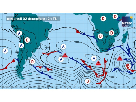 A partir de mercredi, une bonne première moitié des concurrents se retrouvera dans le sud de l'Océan Indien sous l'influence des dépressions circulant plus au sud. Il faudra veiller à ne pas descendre trop bas pour éviter la situation de fort coup de vent et une mer formée avec des vagues de 4 à 6 m. L'orientation des vents au SW pour les premiers les obligera probablement à faire une route vers l'ESE.