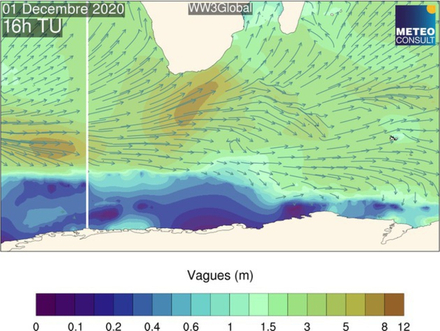 La tête de course se retrouvera sous un flux de sud-ouest dominant un peu moins favorable que la veille et avec des vents moyens entre 20 et 30 nœuds et des rafales entre 30 et 40 nœuds. On peut donc dire que le vent refusera ce mardi pour les marins et donc les vitesses de progression devraient être plus lentes qu’en journée de lundi. De plus les conditions de mer deviendront fortes avec des vagues entre 5 et 7 mètres (voir carte ci-dessous), une situation sportive et non de tout repos pour les skippers !