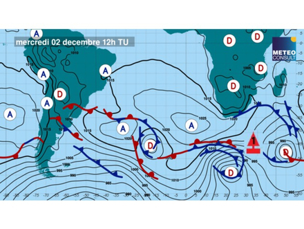 Ce mercredi, l’anticyclone de Sainte-Hélène poursuivra son extension vers le Cap de Bonne Espérance, empêchant les dépressions de remonter trop au nord. La dépression qui concernait la tête de course en ce début de semaine sera située à l’entrée de l’Océan Indien et se creusera encore vers 980 Hpa.