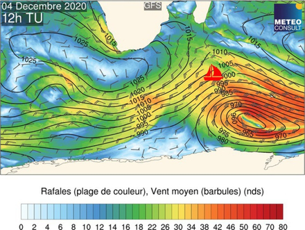 La carte ci-dessus montre que ce vendredi 4 décembre, la tête de flotte se situe pile au nord du complexe dépressionnaire qui engendre des vents tempétueux au sud des îles de Kerguelen. Un vaste anticyclone s’étend toujours dans l’océan indien des côtes ouest Australiennes à l’île de la Réunion. On note le gradient isobarique très resserré au sud de la flotte, témoin de vents particulièrement violents.