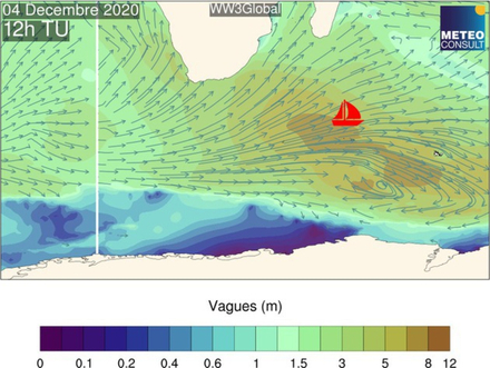 La carte ci-dessus montre que la tête de flotte progressera rapidement vers l’est sous un vent de secteur ouest-sud-ouest de 25 nœuds de moyennes et avec des rafales de près de 35 nœuds. Les skippers resteront toujours soumis à un régime d’averse à l’arrière d’un front froid qu’ils continueront de suivre. En tout cas ces dépressions sont de véritables tempêtes autour de 55°S, engendrant des vents en rafales de plus de 60 nœuds. La houle générée par ces dépressions est également forte avec des vagues de plus de 8 mètres. Les skippers se trouvent heureusement suffisamment au nord pour que les vagues n’excèdent pas 5 à 6 mètres, ce qui constitue tout de même de fortes conditions de mer.