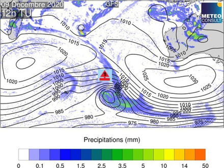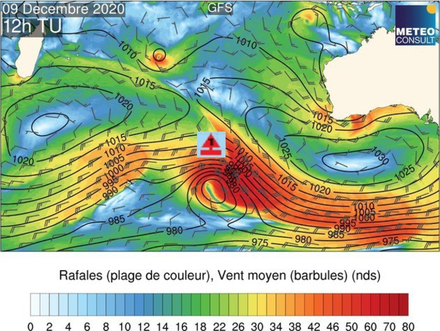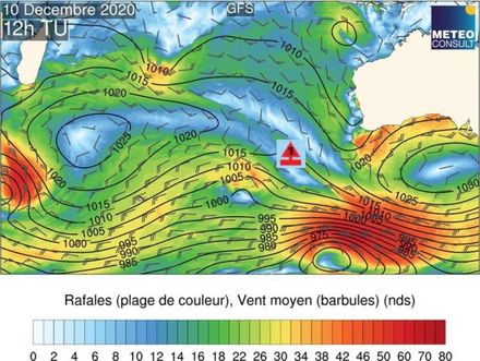 Ce mercredi, la dépression continue de se creuser (965hPa) en se dirigeant vers le sud-sud-est. Après une nuit éprouvante dans des vents encore très forts et une mer grosse, les conditions commencent à s’améliorer en matinée. A l’arrière d’un front le vent s’oriente à l’ouest nord-ouest puis à l’ouest dans l’après-midi obligeant le navigateur à mettre un peu de sud dans sa route.