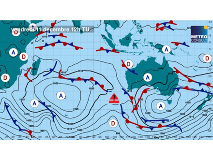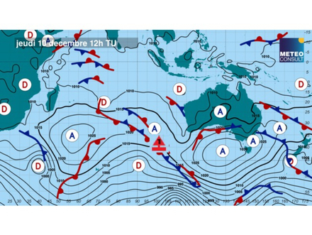 Les conditions de vent devraient rester favorables pour les navigateurs avec un régime d’ouest modéré entre une dorsale installée dans le sud-ouest de l’Australie et une nouvelle dépression évoluant dans le sud des navigateurs. Cette dernière sera beaucoup moins virulente que la dernière et circulera très au sud de la route des navigateurs. Ils pourront donc profiter d’un vent d’ouest d’une quinzaine de nœuds qui leur permettra de se rapprocher des côtes australiennes en faisant quelques empannages sur leur route.