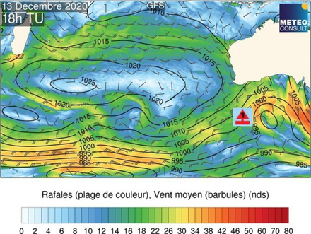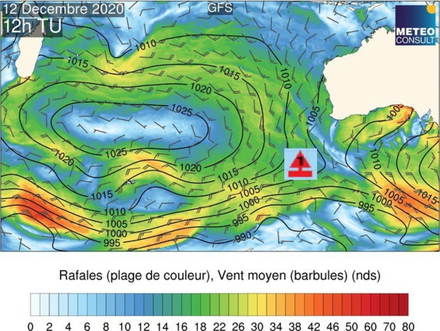 La dépression orageuse continuera de se creuser (972 hPa) mais s’éloignera assez rapidement vers le sud si bien que les navigateurs retrouveront un flux de sud-ouest assez fort puis plus modéré, en bordure nord-ouest du système dépressionnaire. Après quelques heures de conditions musclées, ils retrouveront donc une situation météo plus favorable avec un vent moins fort. Le flux de sud-ouest permettra de faire une trajectoire vers l’est avec un bon angle au vent pour retrouver de la vitesse.