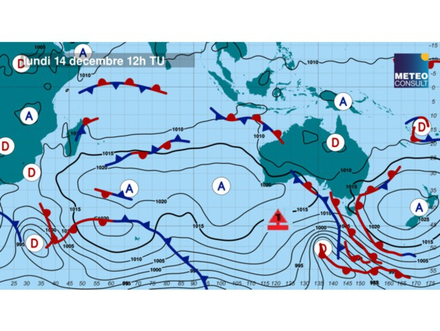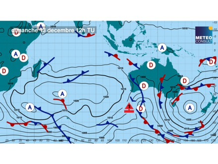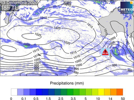Ce dimanche les leaders de la course croiseront une dépression orageuse venue d’Australie. Elle se creusera rapidement en progressant vers le sud (990 hPa à la mi-journée) et sera accompagnée d’une zone de fortes pluies à caractère orageux. Naviguant dans l’ouest de la dépression, ils verront donc le vent de sud se renforcer nettement en progressant à la longitude du Cap Leeuwin qu’ils devraient atteindre au cours de cette journée de dimanche.