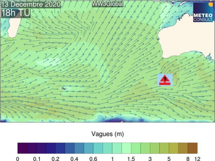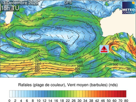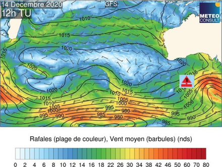 La carte de champ de vent ci-dessus montre bien le flux de sud-ouest dynamique en bordure de la dépression. Avec un vent moyen de l’ordre de 25 nœuds dans une mer encore agitée, les marins progresseront assez vite vers l’est avec un bonne angle au vent. On voit l’arrivée des hautes pressions par l’ouest avec un vent qui perdra de son intensité en fin de journée, en bordure des hautes pressions.