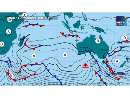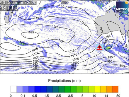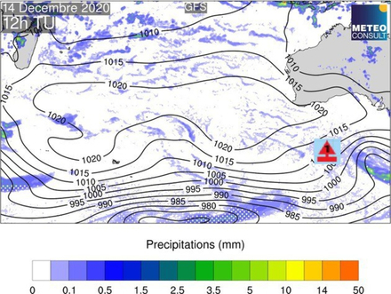 La dépression orageuse s’éloignera rapidement vers le continent antarctique si bien que les navigateurs retrouveront un flux de sud-ouest assez fort en bordure nord-ouest du système dépressionnaire.