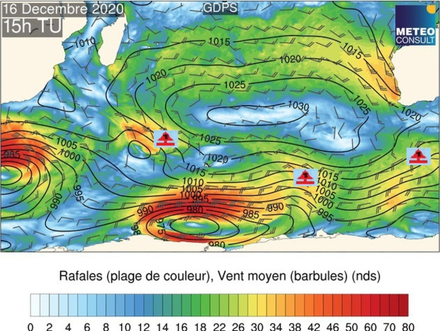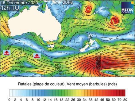 A l'opposé, les derniers vont subir du gros temps sous l'influence de la dépression des Kerguelen, générant de fortes conditions de mer et de vent dans ces parages.