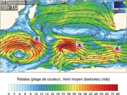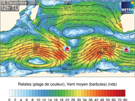 Cette situation sera un passage à négocier qui pourrait modifier le classement et dont les skippers scrutent dés à présent son évolution. Les conditions ne s’annoncent pas cependant trop fortes en raison du gradient de pression pas trop resserré (donc pas de menace de tempête). Elle occasionnera néanmoins une rupture dans la circulation du grand flux d’ouest à nord-ouest régulier. Il faudra envisager de passer encore une fois au sud et la laisser s’éloigner vers l’est tout en évitant la baisse des vents dans le creux isobarique, puis changer de direction. Les premiers tenteront de toucher la bascule des vents au secteur nord-ouest après le passage de cette dépression, qui continuera à descendre vers le grand sud en se creusant. Celui qui touchera ce vent favorable pourrait donc effectuer un coup de maître !