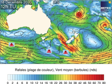 Plus en arrière, les 5 à 10 ème concurrents de la flotte vont se faire rattraper par le coup de vent (force 8 Beaufort) lié à la dépression des Kerguelen. Cela va les obliger à contourner cette zone de gros temps au nord, à moins de choisir une option plus risquée mais plus courte qui consiste à faire route vers l'ESE, quitte à naviguer dans des conditions assez musclées. Le groupe de queue, très étalé lui entre la 15ème position et le dernier, seront à l'arrière de la dépression des Kerguelen, avec un flux favorable basculant au nord-ouest.