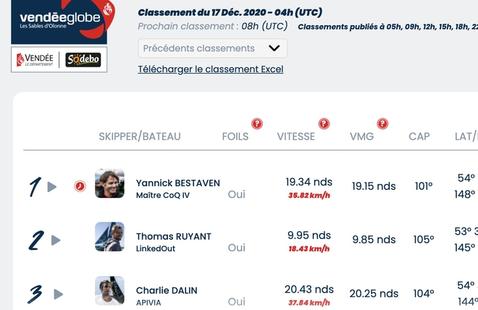 Ce jeudi, le classement de tête restait le suivant : Y.Bestaven en tête, suivi de T.Ruyan en deuxième positon malgré son avarie d'hier soir, puis C.Dalin qui résiste en 3 ème place. Notons la résistance de J.Le Cam en 4ème place, en véritable loup de mer !