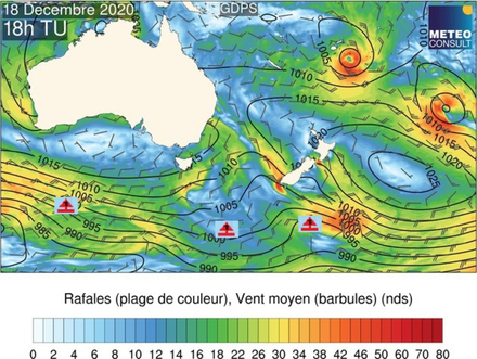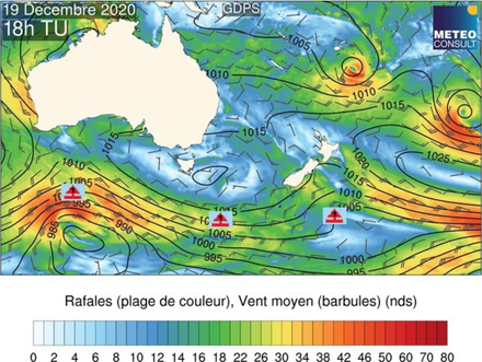 Ce samedi marquera pour les 2 ou 3 premiers une entrée ralentie dans l'océan Pacifique, toujours derrière de la dépression tasmanienne qui poursuivra sa descente vers le sud-est. A l'arrière, le flux ne se rétablira pas vraiment, avec une zone intermédiaire de molle que l'on appelle un "col barométrique". Il subsistera un peu d'air quand même, de secteur ouest dominant, avec des variations entre le sud-ouest et le nord-ouest.