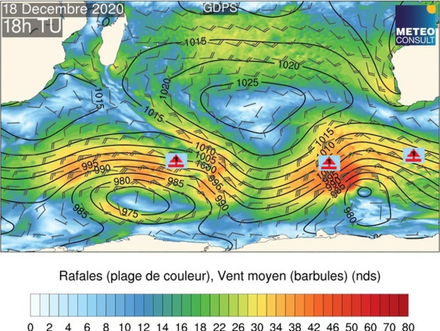 Plus à l'arrière, le groupe des 15 à 20 rencontrera des conditions fortes en liaison avec la grosse dépression des Kerguelen qui circule dans leur sud et leur génére un risque de coup de vent force 8 Beaufort de secteur ouest à nord-ouest. La course devrait gagner en vitesse pour ces skippers positionnés actuellement au milieu de la flotte.
