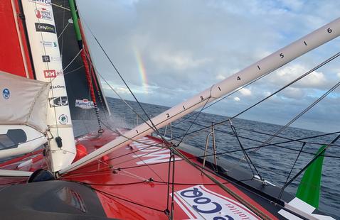 "J’ai fait un empannage, c’est long comme manœuvre ! Je n’étais pas configuré sur ce bord-là, donc j’avais des trucs à installer à droite à gauche, les prochains seront plus rapides ! C’est une magnifique journée par 55° sud. Il fait super beau par rapport au 3 degrés d’hier. Un temps de printemps, avec du soleil, une température fraîche mais le soleil réchauffe. Il fait 12 degrés grâce à l’effet de serre de mon cockpit. J’ai un petit calendrier de l’avent avec des bonbons, des photos et ce matin c’était une photo de mon fils alors je me suis dit que ça allait être une bonne journée, et pour l’instant c’est le cas.