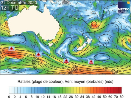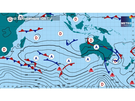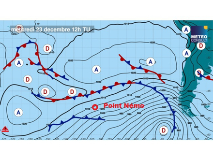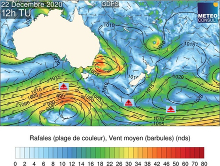 Pour le milieu de semaine et la période de Noël, l'avancée des concurrents en accordéon devrait se poursuivre de l'océan Indien au Pacifique. A l'avant, un anticyclone viendra faire barrière au trio de tête les obligeant à raser au plus près la zone d'exclusion dans un vent instabke de secteur entre 10 et 15 noeuds. A l'arrière, les poursuivants profiteront de meilleurs conditions dans un flux de nord-ouest pour réduire un peu les écarts..