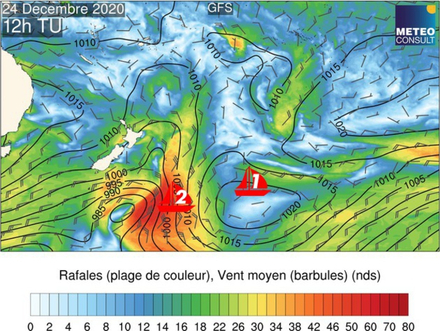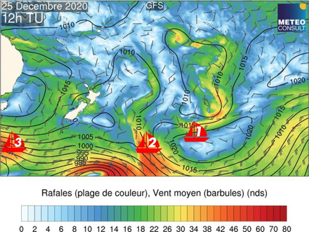 Ceux du groupe de tête qui auront pris l’option la plus au nord progresseront face à des vents de secteur est se renforçant à 20-25 nœuds en moyenne. Ils retrouveront dès lors les vitesses perdues ces derniers jours. En revanche, ceux d’entre eux qui auront choisi une trajectoire sud devraient encore subir des vents faibles (7-10 nœuds). Les skippers du groupe 3 devraient eux connaître les vitesses de progression les plus élevées, en raison de vents portants de secteur nord-ouest de 25-30 nœuds et des rafales à plus de 40 nœuds qui leur permettront de réduire les écarts avec ceux devants.