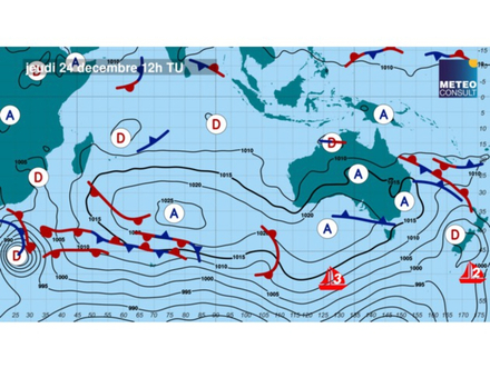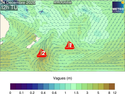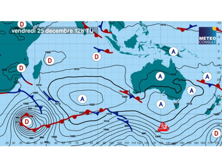 Cette veille de Noël, la tête de course se retrouve toujours sous ou à proximité de la molle anticyclonique. Certains auront peut-être d'ici là pris des options assez tranchées pour revenir devant , comme pourrait le faire Thomas Ruyant ce mercredi qui indiquait avoir plutôt choisi « la bascule que la pression ». Réponse jeudi. La carte ci-dessous montre que les poursuivants du groupe 2, composé en outre de Louis Burton et Clarisse Cremer, évoluent ce jeudi toujours à l’avant d’une dépression se creusant à 978 hPa alors que le groupe 3 avance toujours dans un flux de sud-ouest à l’arrière d’un front froid remontant en direction du sud de l’Australie.