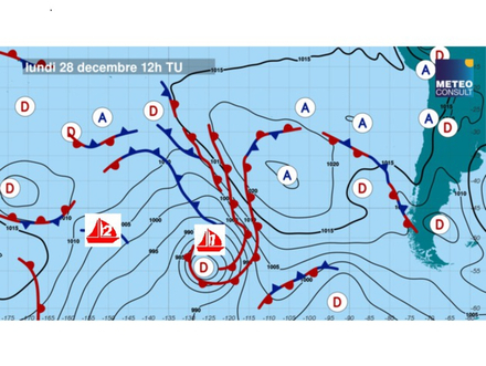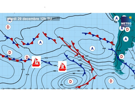 A quelques jours du passage du cap Horn pour les premiers, les conditions continuent de leur être favorables malgré le coup de vent qui les attend après le passage de la dépression qui se trouvait depuis quelques jours derrière eux. Ils bénéficieront d’un fort flux d’ouest leur permettant de grandes vitesses alors que le groupe derrière progressera moins rapidement dans un contexte météo moins favorables avec des vents de sud à sud-ouest très variable. Cette journée sera également moins favorable au groupe positionné près de J. Beyou, dans un flux certes majoritairement portant mais très instable.
