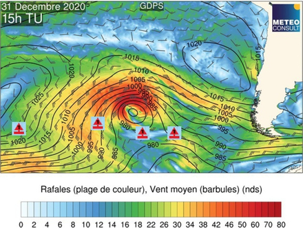Le franchissement du mythique cap Horn se fera à partir de samedi à la mi-journée pour les premiers, qui batailleront dans des vents forts et une mer grosse. Ce sera un évènement pour bien débuter cette année 2021 ! Y.Bestaven et C.Dalin évolueront dans des vents de secteur nord-ouest musclés, probablement même un coup de vent force 8 Beaufort avec possiblement des rafales à près de 45 noeuds. Ce coup de vent est lié à la dépression qui passera sur la Terre de Feu conjugué à l'effet d'accélération habituelle dans cette zone avec la pointe de la Terre de Feu et ses ilôts, dont le Cap Horn est le plus au sud. Ce point est considéré comme le plus austral de l'Amérique du sud.