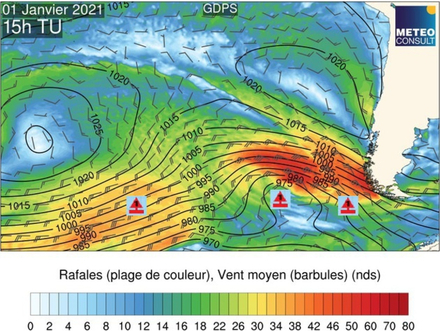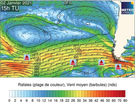 Concrètement, ce vendredi verra le décalage de la dépression au nord des skippers avec dans les parages une situation proche de la tempête qu'ils ne toucheront cependant pas car ils évolueront au sud de celle-ci. En revanche, l'état de mer se dégradera. La mer deviendra croisée avec des trains de houle de directions différentes. Il semblerait que le peloton des 5 premiers puisse passer dans le sud de cette dépression avec des vents assez variables en direction, mais plutôt de composante nord à nord-ouest. Tout dépendra de l'avancée de la dépression vers l'est, mais les modèles météo sont assez cohérents sur une trajectoire vers les côtes chiliennes.