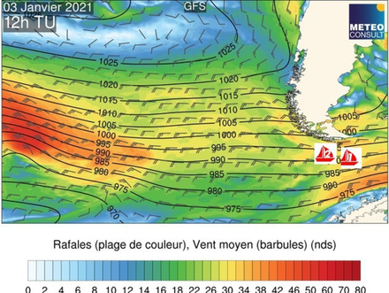 Pour les deux autres groupes qui se rapprochent du Cap Horn, les conditions deviennent plus fortes qu’au cours des dernières heures avec une situation proche du coup du vent parfois dans un flux perturbé et très instable de secteur ouest sous des vagues de 5 m.