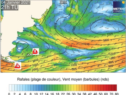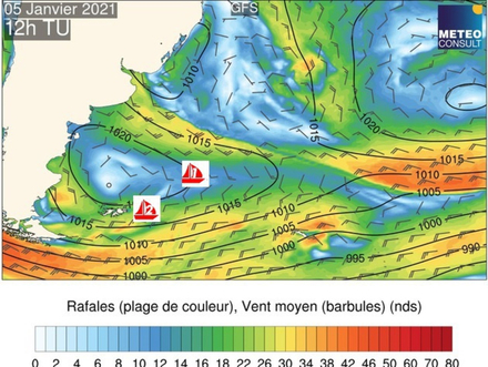 Pour les deux autres groupes qui se rapprochent du Cap Horn, les conditions deviennent plus fortes qu’au cours des dernières heures avec une situation proche du coup du vent parfois dans un flux perturbé et très instable de secteur ouest sous des vagues de 5 m.