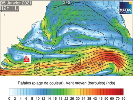 La carte du champ de vent du mardi 5 janvier à 12hTU montre très bien zone de vent faible qui sera située sur la route du navigateur et qui correspond à la zone de hautes pressions. Sa vitesse de progression ralentira nettement et il lui faudra se situer le plus à l’est possible pour passer la dorsale le plus vite possible et trouver le trou de souris pour retrouver du vent sur la bordure nord de l’anticyclone.